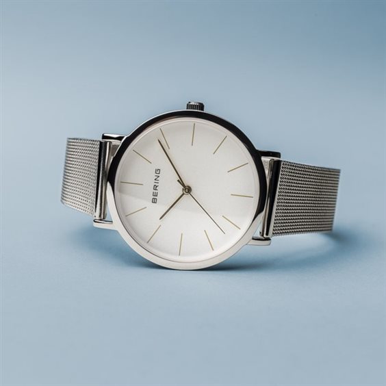 Cassa in acciaio diametro mm.36, quadrante silver con indici laminati oro rosa, vetro zaffiro, movimento al quarzo, bracciale maglia Milano con fibbia regolabile, impermeabilità 3 atm., garanzia 3 anni.