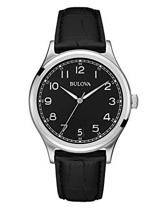 orologio Bulova Uomo collezione Vintage.cassa acciaio con cinturino in pelle stampata nero. vetro minerale. quadrante nero con datario numeri silver.