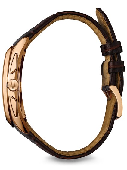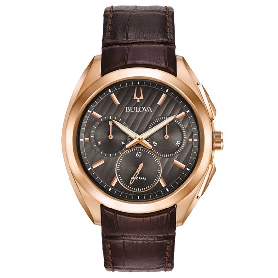 Orologio Cronografo Di Bulova Da Uomo Della Collezione Progressive Dress Curv. Modello Chrono Con Tecnologia Precisionist Caratterizzato Da Cassa Tonda Curva In Acciaio Rose Gold e Cinturino In Pelle Marrone Alligatore. Il Vetro È Di Tipo Zaffiro Curvo E Il Quadrante È Grigio Con Pattern A Righe E Dettagli Rose Gold. Lancette In Superluminova - 5 Sfere. Quadrante E Lancette Curvi. La Cassa Ha Diametro 45 Mm E Spessore 9,6 Mm. La Resistenza All'Acqua È Di 3 Atm.