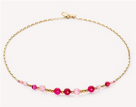 Vivace collana della nostra Candy Collection con sfere di agata fucsia su una catenella geometrica in acciaio inossidabile oro. Da coordinare: i romantici orecchini in oro e rosé.