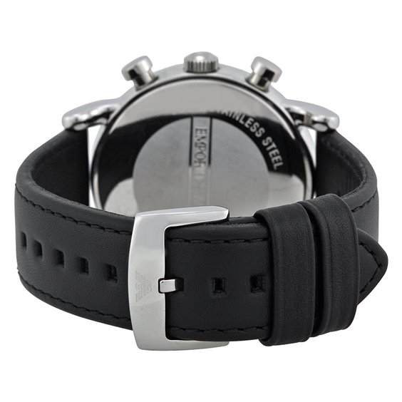 Orologio cronografo da uomo con cassa in acciaio inossidabile, quadrante nero con datario. Cinturino in pelle nero, movimento al quarzo.