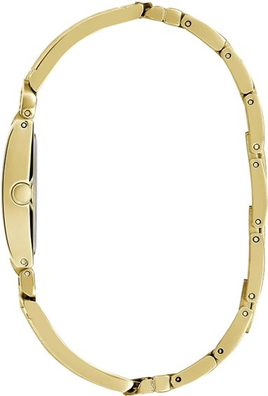 Orologio da donna di Guess della collezione MOD ID. Orologio con movimento al quarzo , display analogico e resistenza all'acqua di 30mt. La cassa è realizzata in acciaio riciclato di forma rettangolare e di colore gold tone. La dimensione della cassa è: 24 mm. Il quadrante è di colore champagne e il cinturino in colore gold tone con chiusura a G-Link.