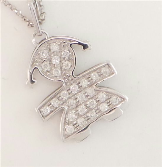 Ciondolo con sagoma femminuccia in oro bianco in pavé di brillanti ct. 0,39, con catena in oro bianco. Tutti i gioielli della linea le Bebé possono essere personalizzati.