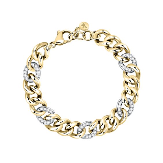 Bracciale donna , acciaio 316L , finitura in PVD oro giallo , catena maglia groumette , lunghezza cm 20 regolabile , maglie con zirconi bianchi. Scatola e garanzia originali.
