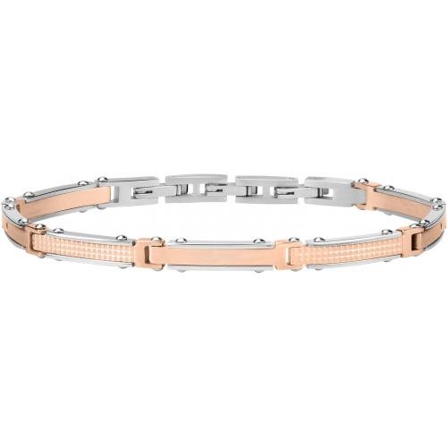 Bracciale uomo , acciaio 316L , maglia fantasia , lunghezza cm 20 regolabile fino a cm 17 , finiture in PVD oro rosa , zircone nero incastonato con griffe. Immagine indicativa , la confezione può variare di forma e colore , scatola e garanzia originali.