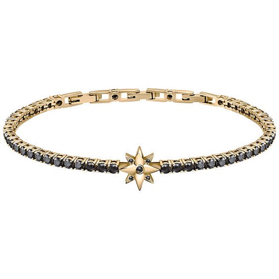 Bracciale Tennis Da Uomo Della Collezione Tennis Di Morellato. Bracciale Tennis Realizzato In Argento 925‰ Con Placcatura Oro Giallo E Zirconi Neri Con Simbolo Rosa Dei Venti Come Centrale. Misura Bracciale 22 Cm. Accorciabile A 18,5 Cm. Questo bracciale verrà spedito con Certificato Di Autenticità E Scatola Originale Morellato.