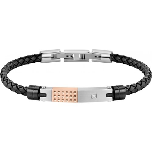 Bracciale uomo , spezzoni in pelle intrecciata nera , targhetta in acciaio 316L , finiture in oro rosa , zircone bianco incastonato , lunghezza cm 22 regolabile fino a cm 22. Immagine indicativa , la confezione può variare di forma e colore , confezione e gararnzia originali.