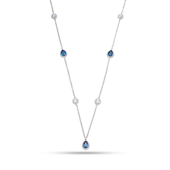 Collana donna in argento 925% , catena maglia rolò , lunghezza cm 85 regolabile fino a cm 80 , zirconi bianchi e blu incastonati. Immagine indicativa , la confezione può variare di forma e colore.