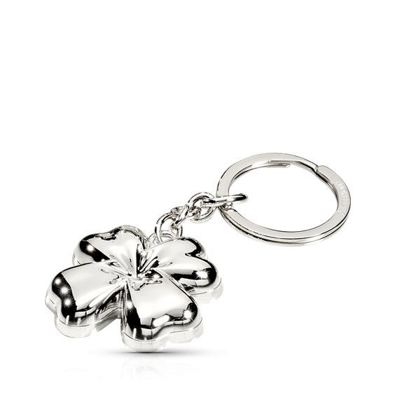 Portachiavi in acciaio 316L , forma quadrifoglio bombato con cristalli bianco , lunghezza cm 9.5. Immagine indicativa , la confezione può variare di forma e colore.