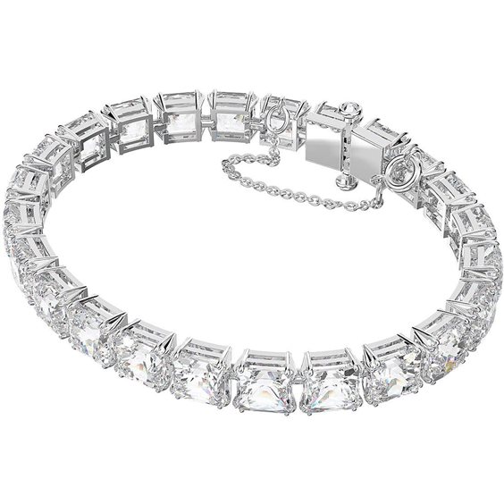 Questo bracciale è raffinatamente lavorato con cristalli dal taglio square su una montatura a griffe placcata in rodio ed è rifinito con una chiusura a scomparsa. Progettato per la fluidità e dotato di una finitura di lusso, questo oggetto si può indossare come nuovo elemento essenziale del guardaroba da solo, oppure abbinato ad altri bracciali della linea Millenia, per ottenere un effetto moderno e spettacolare al tempo stesso. Questo bracciale è firmato dalla Direttrice creativa Giovanna Engelbert per la Collection III. Come chiuderlo e aprirlo: far scorrere i ganci nei corrispondenti fori alla base dell'ultimo cristallo e premere per incastrarli. Fissare la catena di sicurezza utilizzando la piccola chiusura a leva. Per aprire, sganciare la catena di sicurezza e premere contemporaneamente i pulsanti su entrambi i lati della pietra per rilasciare i ganci. Colore: Bianco Lunghezza minima: 17 cm Lunghezza massima: 19 cm Larghezza: 0.7 cm Materiale: Cristalli, Placcatura rodio, Zirconio Tipo di fermaglio: Chiusura con gancio a W