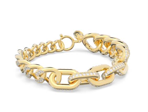 Progettato per essere genderless, questo bracciale impreziosirà qualsiasi look. In perfetta armonia tra l’iconica tecnica pavé di Swarovski e l’audace struttura in metallo, questo pezzo placcato oro aggiunge un tocco contemporaneo ai classici gioielli a catena. Presenta una raffinata chiusura a molla e può essere indossato con qualsiasi outfit, dal tailleur per l’ufficio a un elegante abito da sera. Parte della famiglia Dextera, questo bracciale è ideato dalla Direttrice Creativa Giovanna Engelbert per la Collection III.