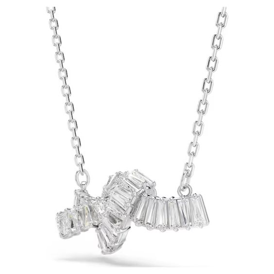 Questo elegante pendente Swarovski è annodato per simboleggiare un legame eterno. Sospeso su una delicata catena, il motivo ispirato a un nastro è placcato rodio e presenta una sofisticata decorazione di Swarovski Zirconia taglio Baguette, ciascuna con montatura a griffe. È un sofisticato gioiello da tutti i giorni che si abbina splendidamente alle altre creazioni Matrix. Immagini a scopo illustrativo.