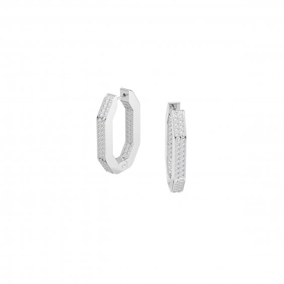 Inno alla sofisticata tecnica pavé di Swarovski, questi orecchini a cerchio medi taglio octagon, dai dettagli intricati e dalla struttura audace, esprimono modernità. Delicati cristalli bianchi posizionati su montature placcate rodio evidenziano un design di ispirazione industriale e si indossano da soli oppure sovrapposti sull’orecchio insieme ad altri pezzi della famiglia Dextera. Parte della famiglia Dextera, questi orecchini sono firmati dalla Direttrice creativa Giovanna Engelbert per la Collection II.