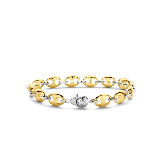Questo bracciale d'argento placcato oro TI SENTO - Milano 2981SY è caratterizzato da una fila di elementi a chicco di caffè uniti da una chiusura d'argento. Il bracciale è realizzato in argento sterling 925. La forma classica del chicco di caffè è rivisitata in chiave contemporanea ed originale. La chiusura di sicurezza assicura che il tuo gioiello resti sempre con te.mis.20