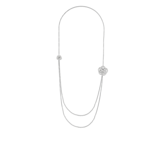 Collana lunga 80 cm in argeno con doppia catena da una parte che lega due rose una più grande e una più piccola in argento e zirconi.