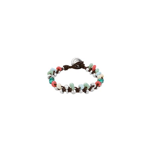 Uno de 50 bracciale SUNSHINE interamente fatto a mano dagli artigiani spagnoli con la base di cuoio marrone include elementi placcati in argento e cristalli artigianali di vari colori del mare: verde, turchese e corallo