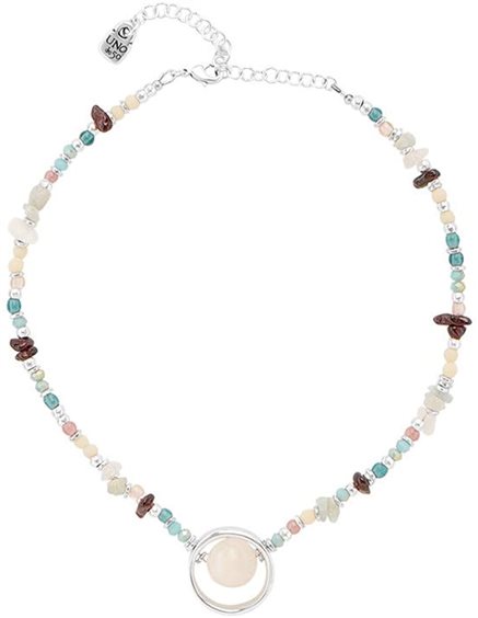Collana midi dal carattere esotico bagnata nell'argento, ornata da cristalli artigianali nei colori pastello, la cui combinazione richiama la bellezza delle pietre naturali. Questo gioiello è composto da diverse pietre artigianali con un ciondolo madreperlato che si spicca come talismano del pezzo. È stato realizzato in Spagna, da UNOde50 secondo un procedimento artigianale.