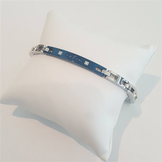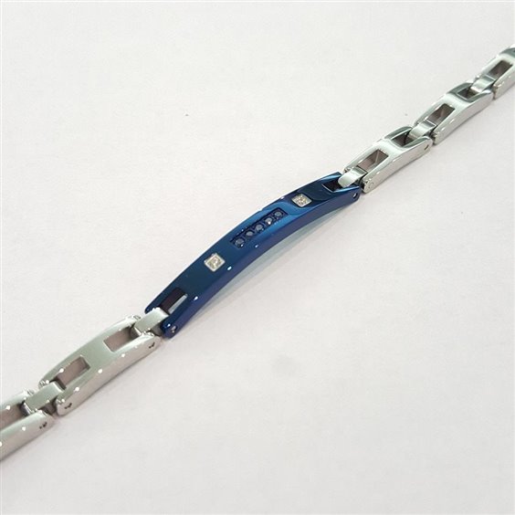 Gioielli in acciaio ipoallergenico 316 L. Disegnati e distribuiti da Zancan srl.BRACCIALE IN ACCIAIO CON PIASTRINA BLU IMPREZIOSITA DA ZIRCONI. LARGHEZZA LAVORAZIONE MM 5,3 LUNGHEZZA CM23.