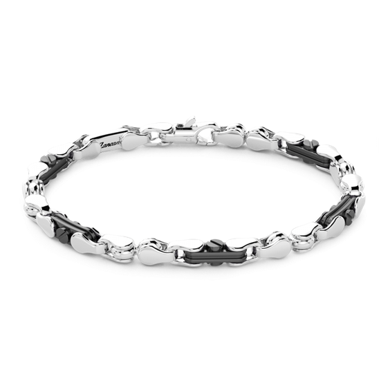 Bracciale Zancan in argento 925, composto da elementi in argento a finitura lucida ed elementi in ceramica nera, che donano uno stile contemporaneo al gioiello. Il bracciale fa parte della collezione Eternity 925, collezione ipirata alle bellezze senza tempo dell'arte e della cultura Italiana. Il bracciale è completamente realizzato a mano in Italia ed ha un peso di 19.20gr.