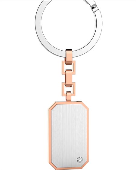 Portachiavi marca "Zancan" in acciaio con parte superiore a finitura satinata e zircone bianco e trattamaneto pvd oro rosa nella parte dietro. Possibilità di personalizzazione con una incisione a piacere . Targa cm 3x1,8.
